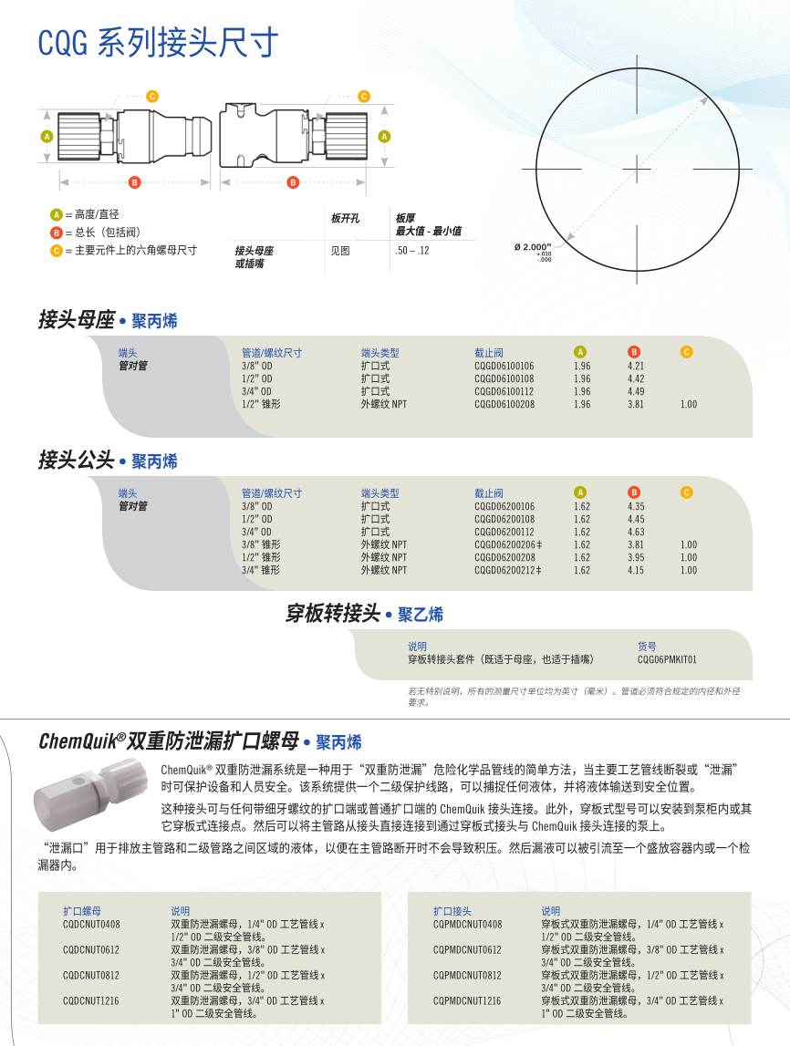CQG Series high purity couplings feature our patented pressure-balanced, non-spill design. Molded virgin polypropylene and a 100% springless flow path provide broad chemical resistance and exceptionally high flow capacity, allowing instant disconnects (and reconnects), even under pressure.